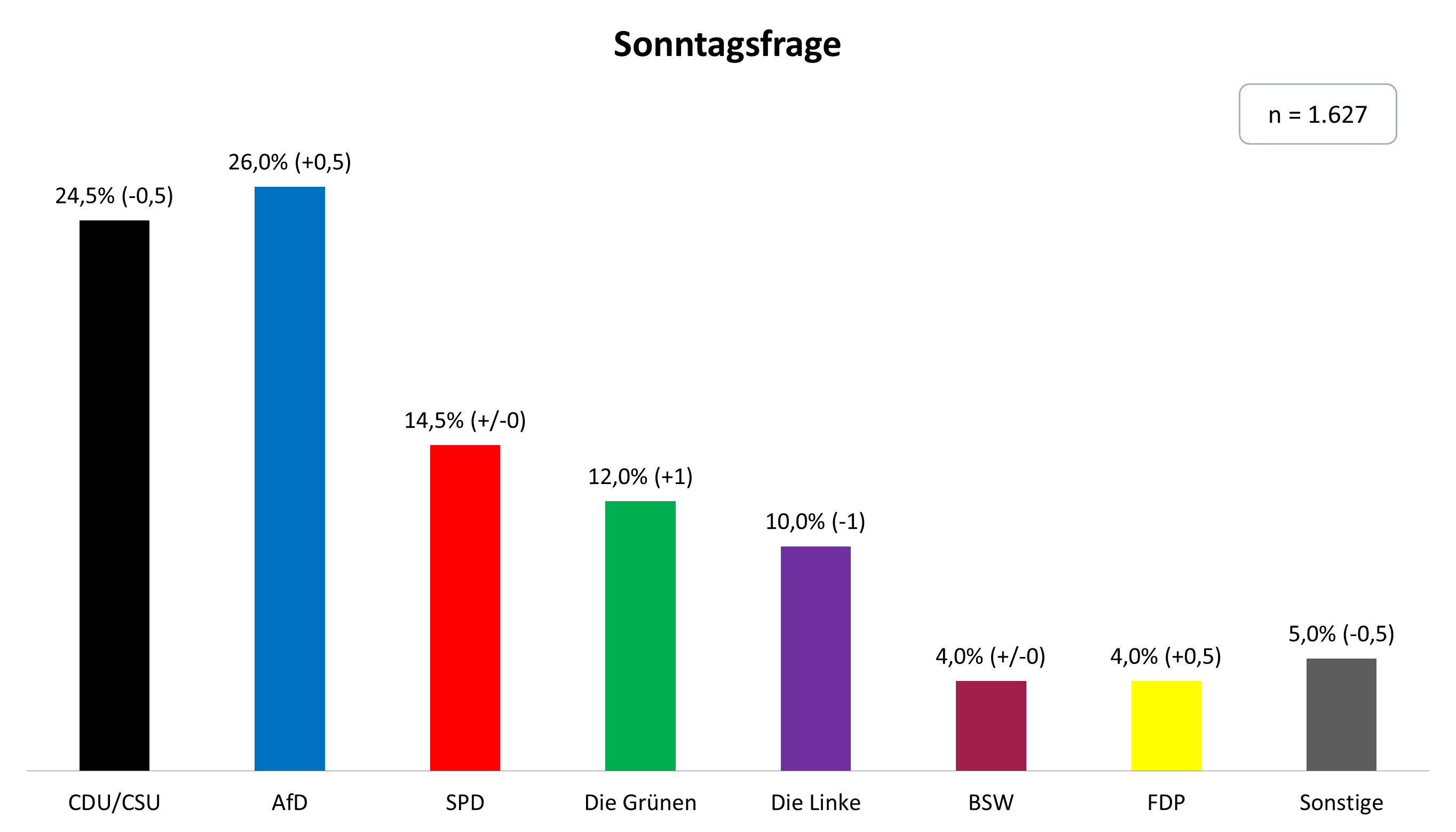 Von DAVID BERGER | Die AfD (26%) legt in dieser Woche einen halben Prozentpunkt zu, wohingegen die Union (24,5 %) einen halben Prozentpunkt verliert. Dahinter folgt unverändert die SPD (14,5 %). Da die Grünen (12 %) einen Punkt hinzugewinnen und die Linkspartei (10 %) einen verliert, sind die Grünen wieder vor der Linkspartei. Das BSW (4 %) bleibt konstant und die FDP (4 %) legt einen halben Prozentpunkt zu. Fünf Prozent (-0,5) entfallen auf sonstige Parteien.