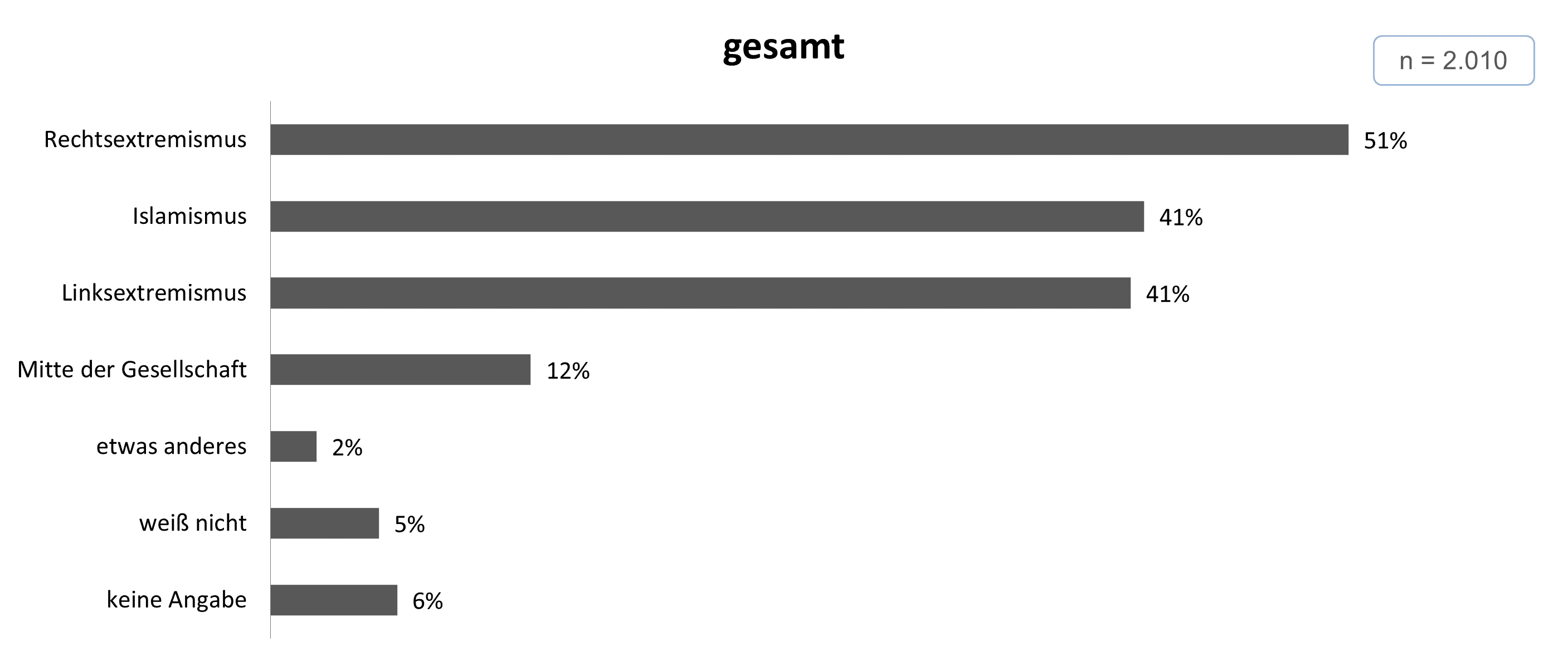 Am häufigsten sind die Befragten der Meinung, dass die freiheitlich-demokratische Grundordnung der Bundesrepublik Deutschland derzeit der Rechtsextremismus gefährdet (51 %). Darauf folgt Islamismus und Linksextremismus mit je 41 Prozent. Zwölf Prozent nennen hier die Mitte der Gesellschaft. Zwei Prozent führen etwas anderes an. Fünf Prozent können und sechs Prozent wollen diese Frage nicht beantworten.
