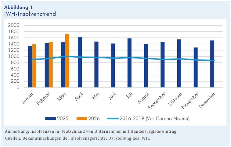 „Die Zahl der Insolvenzen von Personen- und Kapitalgesellschaften in Deutschland liegt laut IWH-Insolvenztrend im März bei 1.716. Das sind 17 Prozent mehr als im Februar, 18 Prozent mehr als im März 2025 und 71 Prozent mehr als in einem durchschnittlichen März der Jahre 2016 bis 2019, also vor der Corona-Pandemie.“