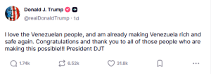 Ich liebe das venezolanische Volk und habe es bereits wieder reich und sicher gemacht. Gratulation und Dank geht an all jene Leute, die das möglich machen!!! Präsident DJT