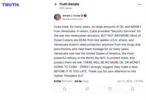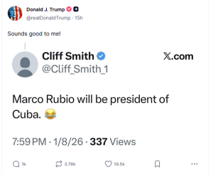 Inzwischen kommentierte Donald Trump auf True Social ein Posting auf X, welches vorweg erklärt, Marco Rubio zum nächsten Präsidenten Kubas ernennen zu lassen: