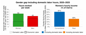 Die Ungleichheit zwischen den Geschlechtern verstärkt sich, sofern unbezahlte Hausarbeit, die überproportional von Frauen geleistet wird, mitberücksichtigt würde. Ohne Berücksichtigung der unbezahlten Hausarbeit fiel die Abweichung zu Lasten der Frauen immer noch auf insgesamt 61%.