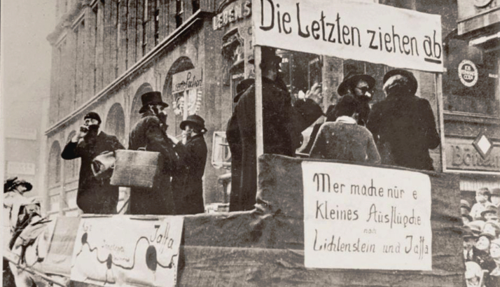 Das war Köln 1936, beschrieben auf LTO. Im Jahr 1938 gab es dort einen Propagandawagen gegen Stalin, große enthauptete Puppen in Russenhemden und als antisemitische Karikaturen Verkleidete – das passt. Nach innen wie nach außen. Der Karneval gliedert sich bruchlos ein in die Erzeugung des Feinds, gegen den demnächst Krieg geführt werden soll. Man macht sich lustig – aber nur über jene, über die man sich lustig machen soll.