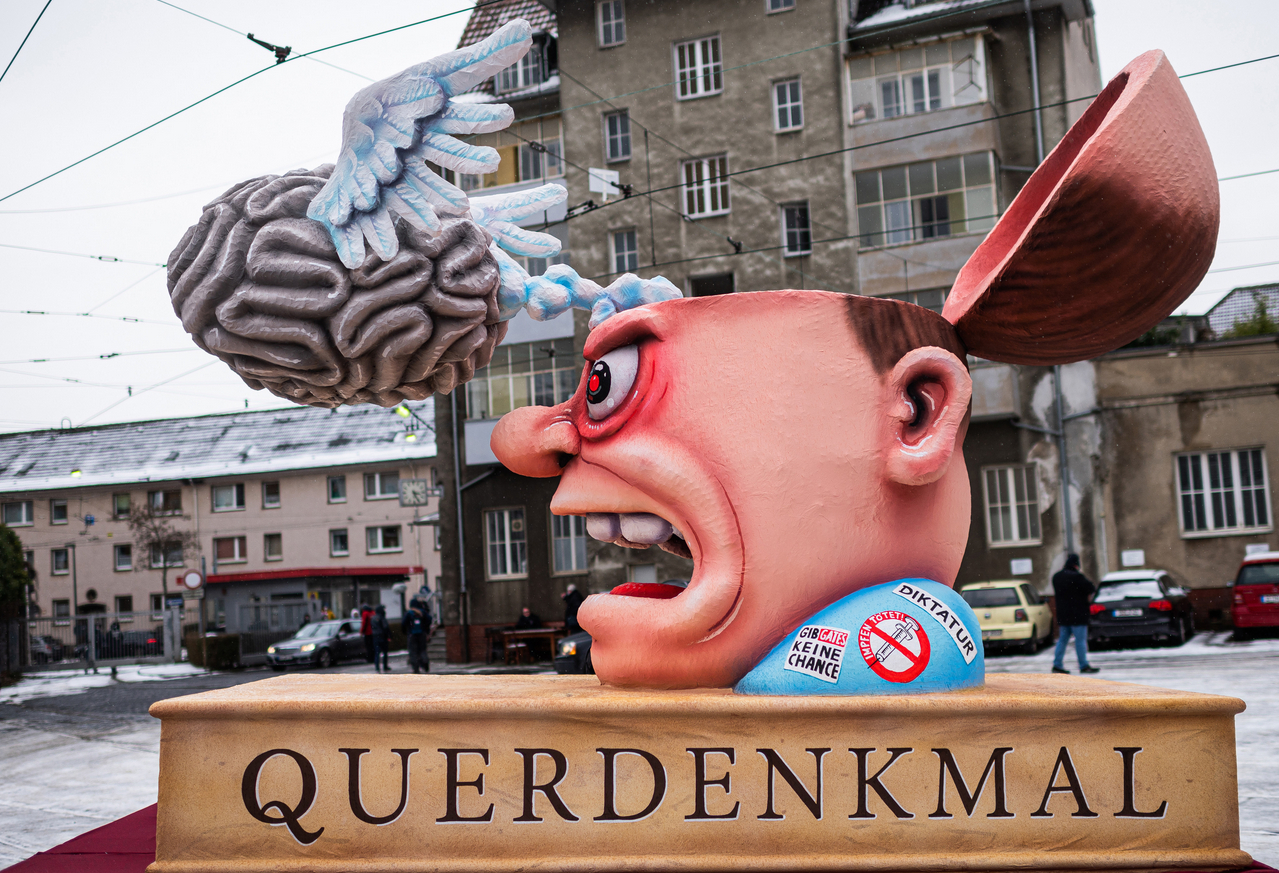 Da gibt es beispielsweise einen Motivwagen von 2017, auf dem die Freiheitsstatue den abgeschlagenen Kopf von Donald Trump hält. Ein Düsseldorfer Wagen, also wahrscheinlich das Werk von Tilly. Im Jahr 2003 gab es noch eine gewisse Kritik an Merkel, die aus dem Hintern eines gigantischen Uncle Sam hervorkroch – aber das ist lange her. Ebenfalls 2017 arbeitete Tilly für die Kampagne gegen den Brexit in Großbritannien. Und zu Corona bastelte er dann einen Wagen, in dem einem „Querdenker“ das Gehirn davonflog.