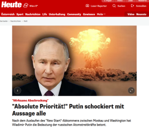 Heute wollen wir deshalb ein Beispiel bringen, wo vor dem Hintergrund des ausgelaufenen START-Vertrages zur Begrenzung der strategischen Atomwaffen in heute.at oberhalb eines durchaus sachlichen Bericht vollkommen normalen Äußerungen Putins angeblich „alle schocken“. Die Schlagzeile wird noch von einem von der Redaktion der genannten Zeitung per Montage so „zurechtgebogen“, sodass man annehmen soll, Putin drohe mit Atombomben. Statt Putin hätte man genausgut jeden anderen Staatschef eines beliebigen Landes, das über Kernwaffen verfügt hernehmen können.
