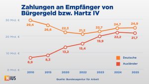 • Im Vergleich zu 2024 sind 2025 die Zahlungen für Transferleistungsempfänger mit deutschem Pass leicht angewachsen – von 24,7 Milliarden Euro auf 24,9 Milliarden Euro.