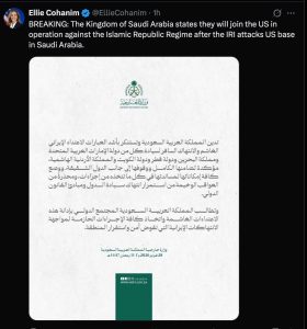 Das Königreich Saudi-Arabien erklärt, es werde sich den USA bei der Operation gegen das Regime der Islamischen Republik anschließen, nachdem die IRI einen US-Stützpunkt in Saudi-Arabien angegriffen hat.