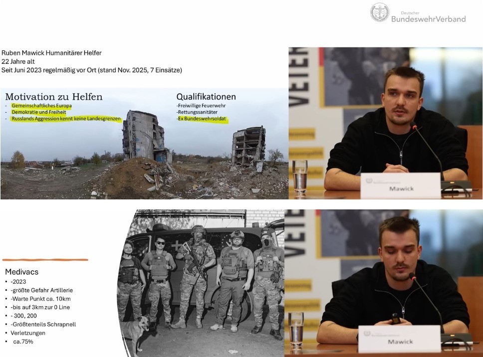 Ruben Mawick ist nicht irgendein Sanitäter. In den letzten Monaten wird er zunehmend von der Bundeswehr als Vortragsredner eingespannt, zuletzt hielt er bei einer Anhörung im Bundestag den Impulsvortrag „Als Sanitäter in der Ukraine – Fronterfahrung und Verwundung“. Über seinen Einsatz berichteten der Bundeswehrverband, Euronews, Bild und weitere Medien. Der 22-Jährige, der sogar eine professionell gestaltete eigene Webseite betreibt, wirkt wie ein perfektes Vorbild: jung, entschlossen und ideologisch robust, unerschütterlich proukrainisch und konsequent antirussisch. Und das Wichtigste: Er geht an die Front!