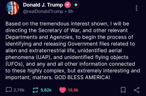 „Aufgrund des enormen Interesses werde ich den Kriegsminister und andere zuständige Ministerien und Behörden anweisen, die Identifizierung und Freigabe von Regierungsakten zu außerirdischem Leben, unidentifizierten Flugobjekten (UFOs) und allen anderen Informationen zu diesen hochkomplexen, aber äußerst interessanten und wichtigen Themen einzuleiten. GOTT SCHÜTZE AMERIKA!“