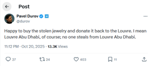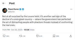 Das schien auch Pavel Durow, dem legendären Gründer von Telegram, aufgefallen zu sein, indem er auf X zwei treffende Kommentare zum besagten „Raubfall Louvre“ absetzte: