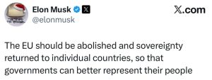 „Die EU muss abgeschafft und die Souveränität an die einzelnen Länder zurückgegeben werden, damit die Regierungen ihr Volk besser vertreten können“, schrieb der Unternehmer im sozialen Netzwerk X.