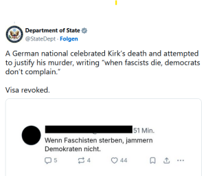 „Die Vereinigten Staaten sind nicht verpflichtet, Ausländer aufzunehmen, die den Amerikanern den Tod wünschen. Das US-Außenministerium identifiziert weiterhin Visainhaber, die die abscheuliche Ermordung von Charlie Kirk gefeiert haben“, so eine Stellungnahme der Behörde zu dem Visa-Entzug. Betroffen sind neben dem anonymisiert gezeigten Deutschen auch ein Argentinier, ein Südafrikaner, ein Mexikaner, ein Brasilianer, und ein Paraguayer.